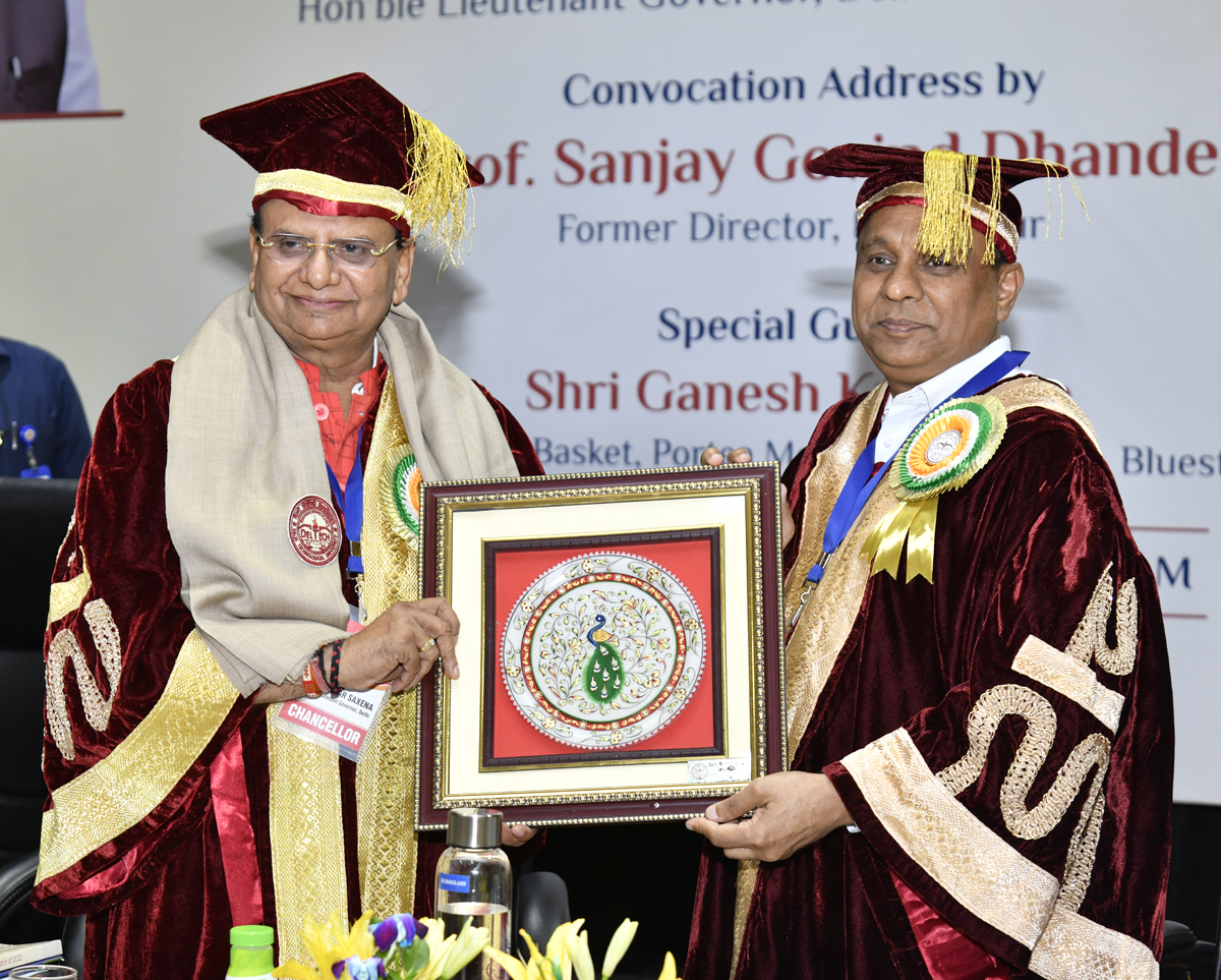 उपराज्यपाल से पूर्व समारोह के मुख्यातिथि आईआईटी कानपुर के पूर्व निदेशक प्रो. संजय गोविंद ढांडे ने अपने संबोधन में डिग्रीधारकों को बधाई एवं शुभकानाएं देते हुए कहा कि भावी जीवन में वांछित सफलता के लिए उन्हें अपने लक्ष्यों को अपने दिमाग में याद रखना चाहिए। परिस्थियों से प्रभावित होकर अपने सपनों को मत छोड़ें। उन्होने शिक्षा पूरी करके विश्वविद्यालय के परिवेश से व्यावहारिक दुनिया में कदम रखने जा रहे युवाओं को संदेश दिया कि जोखिम लेने से न घबराएं, अगर जोखिम नहीं लेंगे तो टेक्नोलोजी का विस्तार नहीं होगा। उन्होने कहा कि अपने निर्णयों और अपनी महत्वाकांक्षाओं में विश्वास रखें। अच्छे व्यक्तित्व के महत्व को समझें और अपने कार्यों में ईमानदारी रखें। नकारात्मकता से दूर रहें। उन्होने विद्यार्थियों से कहा कि आज आपके परिजनों व शिक्षकों के लिए भी गर्व का दिन है। ये लोग आपसे बहुत अपेक्षाएं रखते हैं। आपको उन पर ऊर उतरना है।