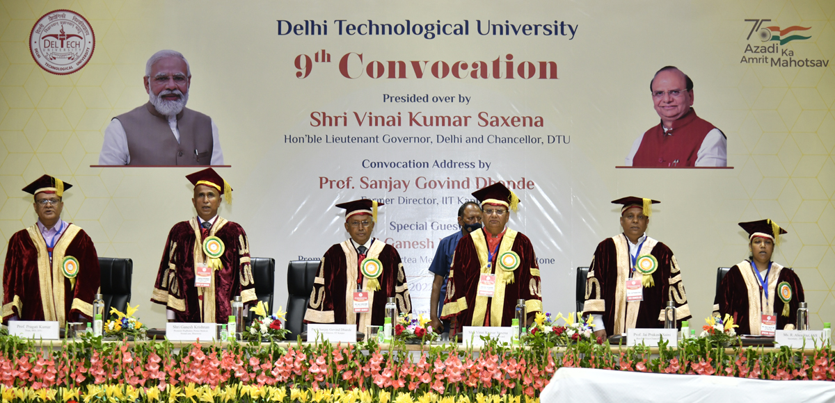 दिल्ली प्रौद्योगिकी विश्वविद्यालय का 9वां दीक्षांत समारोह गुरुवार, 25 अगस्त 2022 को डीटीयू के बीआर अंबेडकर सभागार में आयोजित किया गया। समारोह के दौरान 3182 विद्यार्थियों को डिग्रियां प्रदान की गई। दिल्ली के उपराज्यपाल एवं डीटीयू के माननीय कुलाधिपति विनय कुमार सक्सेना ने समारोह की अध्यक्षता की जबकि आईआईटी कानपुर के पूर्व निदेशक प्रो. संजय गोविंद ढांडे मुख्य अतिथि के तौर पर उपस्थित रहे और दीक्षांत-भाषण दिया। इस अवसर पर बिग बास्केट, पोर्टेया मेडिकल, होमलेन व ब्लूस्टोन के प्रोमोटर गणेश कृषणन तथा डीटीटीई की सचिव सुश्री आर. एलिस वाज ने समारोह में विशेष अतिथि के तौर पर शिरकत की। इस अवसर पर उपराज्यपाल ने विद्यार्थियों को सफलता के मंत्र भी दिये।