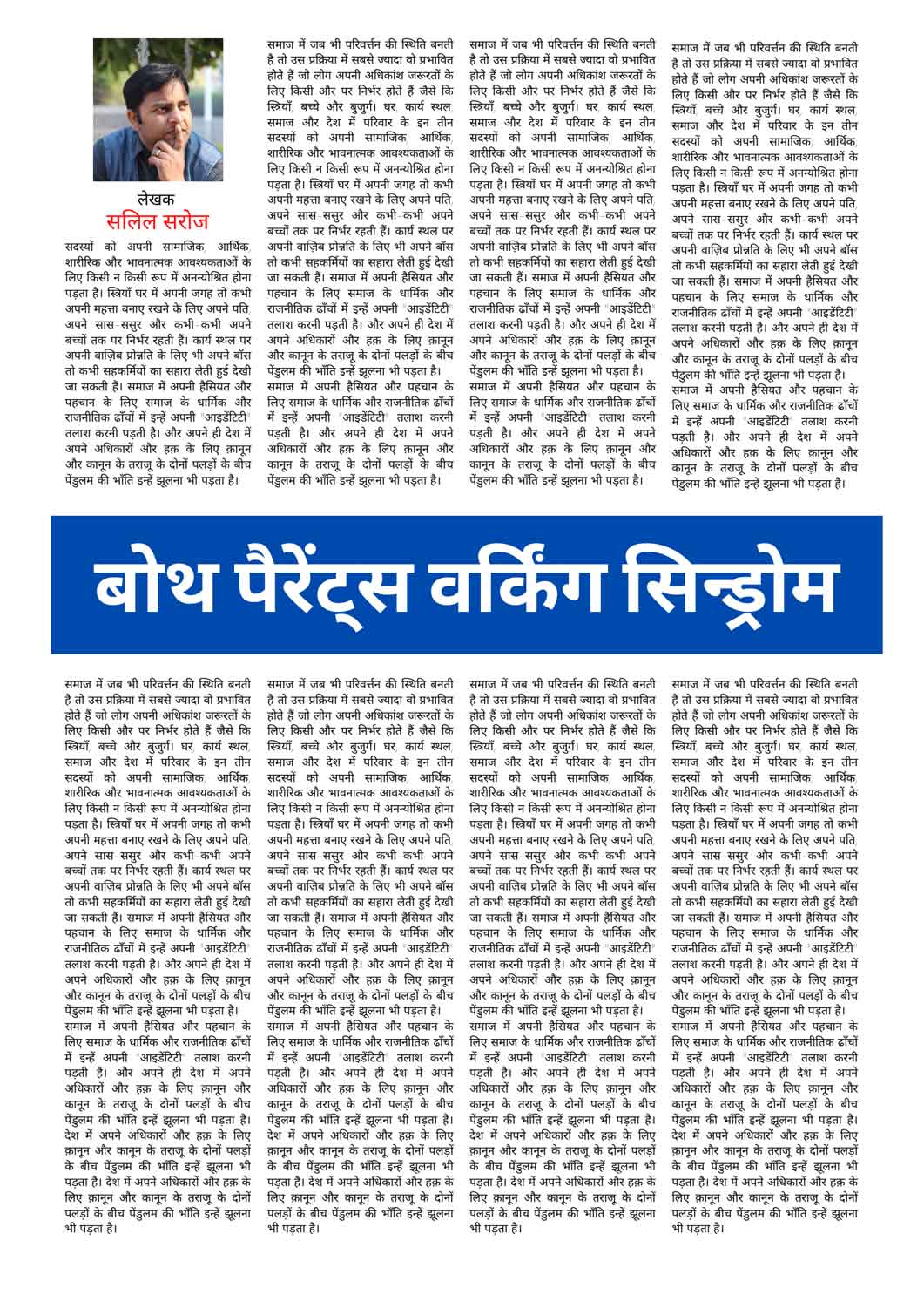 बोथ पैरेंट्स वर्किंग सिन्ड्रोम (बी पी डब्ल्यू एस) प्रायः मिडिल क्लास परिवार में देखने को मिलता है जहाँ 8 बजे सुबह माँ-बाप ऑफिस के लिए, बच्चे स्कूल के लिए, बुजुर्ग किसी क्लब, पुस्तकालय या पार्क के लिए निकल जाते हैं। बच्चे फिर दिन भर के लिए किसी दाई या घर में दादा-दादी हुए तो उनके सहारे पलने-बढ़ने लगते हैं लेकिन जिनकी जरूरत सबसे ज्यादा होती है वो ही कहीं देखे नहीं जाते हैं। इस तरह के माहौल में पले बच्चों के लिए माँ-बाप का आस पास नहीं होना एक “न्यू नार्मल” बन जाता है और घर पर जब माँ-बाप होते हैं तो उस वक़्त को काटने के लिए वो फिर फोन, वीडियो गेम या किसी अन्य हॉबी का सहारा लेना शुरू कर देते हैं। बच्चे इस क्रम में एकाकीपन को एक सामान्य प्रक्रिया के रूप में देखने लगते हैं और भीड़ या दोस्तों की टोली में खुद को जोड़ नहीं पाते और आगे चल कर यह भीड़ जो कभी प्रतिस्पर्धा बन जाती है, कभी सामाजिक प्राणी की जरूरत बन जाती है तो कभी सबसे बड़ी हक़ीक़त बन जाती है तो बच्चों में हीन भावना घर करने लगती है। शरू में सबको यह सामान्य लगता है लेकिन जब बच्चा हर बात पर माँ-बाप से अपनी बात ना कहकर छिपाने लगे, झूठ बोलने लगे, किसी गलत आदत या संगति का शिकार होने लगे तो बात चिंताजनक प्रतीत होने लगती है। माँ-बाप के होते हुए बिना माँ-बाप के सप्ताह के 5 से 6 दिन लगातार 12 से 15 घंटे किसी और के साथ काटना ही बच्चों को माँ-बाप से अलग करने लगती है। काम के बोझ के कारण माँ-बाप दोनों के लिए पारिवारिक और सामजिक जिम्मेदारियों को निभाना कठिन होने लगता है। आपस में तनाव बढ़ने लगते हैं और स्थिति अलग होने तक आ पहुँचती है और इन सब में इनके आक्रोश और दुर्व्यवहार का शिकार होना पड़ता है बच्चों को। बच्चे दूसरे बच्चों को घूमते देखते हैं, कुछ नया करते देखते हैं तो उन में भी वो सब अपने माँ-बाप के साथ करने की इच्छा जागृत होती है लेकिन समय की कमी, अरूचि, काम के तनाव की वजह से पर्याप्त समाधान नहीं पाकर बच्चे स्वयं के माँ-बाप को आँकना शुरू करते हैं, उन्हें कमतर समझने लगते हैं और उनके प्रति आदर भाव भी कम कर देते हैं जो एक परिवार के रूप में सबसे बड़ी हार मानी जा सकती है। ऐसे पैरेंट्स मानते हैं कि अभी कमा लेते हैं और बाद में सब इच्छाएँ पूरी कर लेंगें लेकिन वो बाद कभी नहीं आता। समय बदलने के साथ इच्छाएँ बदल जाती है और पिछली इच्छा की जगह कोई नई इच्छा उत्पन्न हो जाती है और उनको पूरा करने की तमाम मापदंड भी बदल जाते है। उदाहरण के तौर पर आज से 20 साल पहले कश्मीर देखने की इच्छा और अब कश्मीर देखने की इच्छा में ढेरों फर्क है। आज कश्मीर में 20 साल पहले जैसे बर्फ नहीं पड़ती, आज कश्मीर एयरपोर्ट पर क्लियर्स के लिए 2 घंटे लाइन में खड़े रहने पड़ता है, डल झील तब इतनी गन्दी और सिकुड़ी नहीं हुआ करती थी