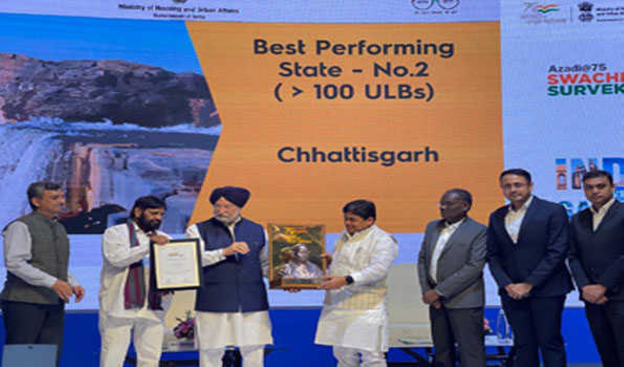 नयी दिल्ली : छत्तीसगढ़ ने एक बार फिर देश के सबसे साफ सुथरे राज्यों में अपने को शुमार करते हुए ‘बेस्ट परफार्मिंग स्टेट’ का द्वितीय पुरस्कार हासिल किया है। राष्ट्रीय राजधानी के ताल कटोरा स्टेडियम में आयोजित स्वच्छ अमृत महोत्सव में राष्ट्रपति द्रौपदी मुर्मू ने ये पुरस्कार प्रदान किये। छत्तीसगढ़ के नगरीय प्रशासन एवं श्रम मंत्री शिवकुमार डहरिया ने पुरस्कार ग्रहण किया। कार्यक्रम में केंद्रीय आवास और शहरी कार्य मंत्री हरदीप सिंह पुरी तथा राज्य मंत्री कौशल किशोर भी मौजूद रहे।