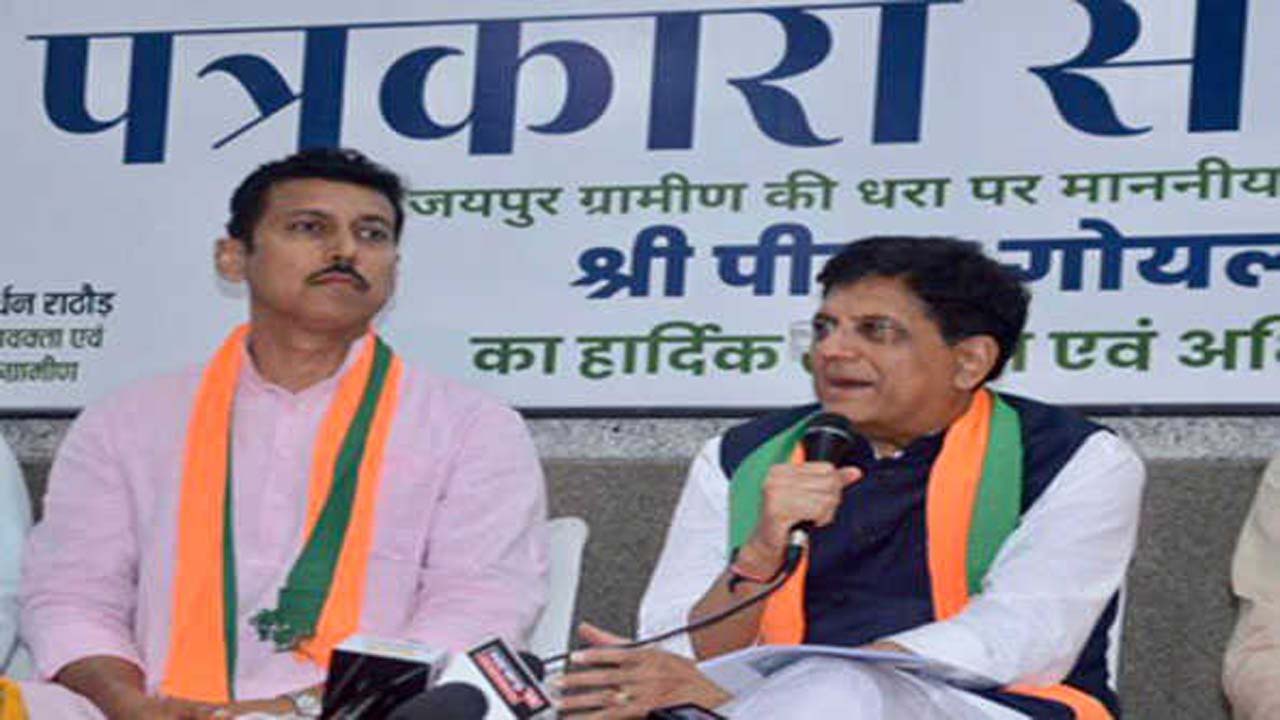 गोयल ने कहा कि अलवर में चंबल से पानी लाने के लिए केंद्र सरकार ने 5782 करोड़ की योजना को मंजूरी दी है लेकिन प्रदेश की गहलोत सरकार ने उसे भी अटका दिया। कांग्रेस सरकार अपने घोषणा पत्र में किए गए वादे तक पूरे नहीं कर पाई। बेरोजगारी भत्ता और किसानों की कर्जमाफी जैसे वादे सफेद झूंठ निकले। प्रदेश में आज उद्योग,व्यापार चौपट हैं विकास की गति पूरी तरह रूक चुकी है। वहीं जब साढ़े चार साल बीत गए तब घोषणाओं के नाम पर आमजन को भ्रमित करने का काम कर रही है।
