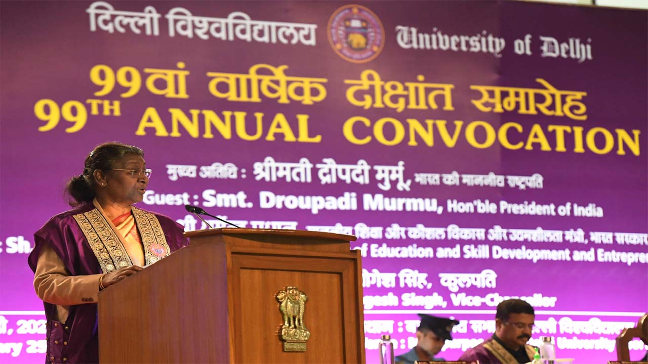 नई दिल्ली : द्रौपदी मुर्मू ने शनिवार को दिल्ली विश्वविद्यालय से समय के साथ अपने में बदलाव लाने तथा देश के अन्य विश्वविद्यलयों के लिए उत्कृष्ट मानक बनने के साथ ही विश्व में अपना विशिष्ट स्थान बनाने का आह्वान किया। मुर्मू ने दिल्ली विश्वविद्यालय के 99वें वार्षिक दीक्षांत समारोह को संबोधित करते हुए इसकी उपलब्धियों का उल्लेख किया लेकिन यह भी कहा कि कोई संस्था हमेशा अपनी पुरानी ख्याति पर निर्भर नहीं रह सकती।