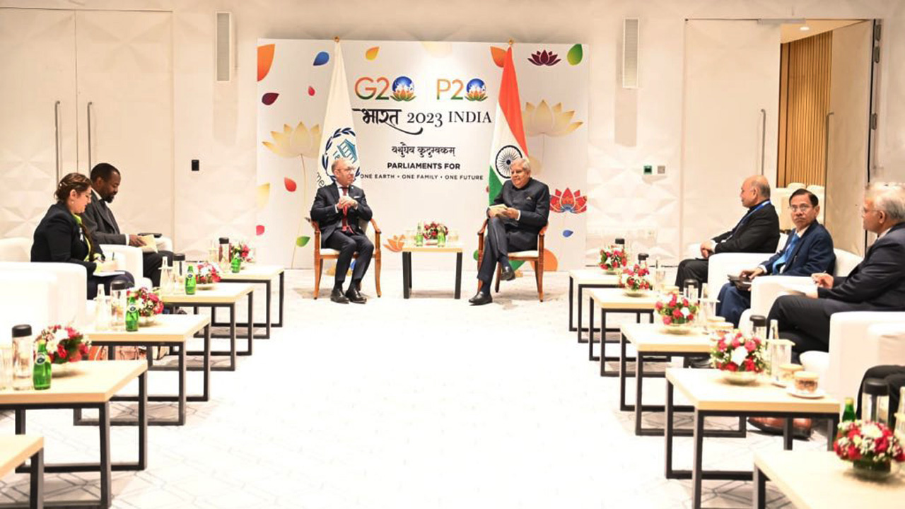 नई दिल्ली : जगदीप धनखड़ ने शनिवार को अंतर संसदीय संघ (आईपीयू)के अध्यक्ष दुआर्ते पचेको के साथ द्विपक्षीय बैठक की और समसामयिक मुद्दों पर विचार-विमर्श किया। धनखड़ और पचेको की यह बैठक यहां यशोभूमि में जी 20 के सदस्य देशों के संसद अध्यक्षों के नौवें शिखर सम्मेलन- पी 20 के दौरान अलग से हुई। दोनों नेताओं की बैठक में अंतर संसदीय सहयोग और विभिन्न देशों की संसदों के बीच अंतर संसदीय संघ की भूमिका पर विचार विमर्श किया गया। धनखड़ और पचेको ने वैश्विक मुद्दों समेत समसामयिक वैश्विक चुनौतियों पर चर्चा की।