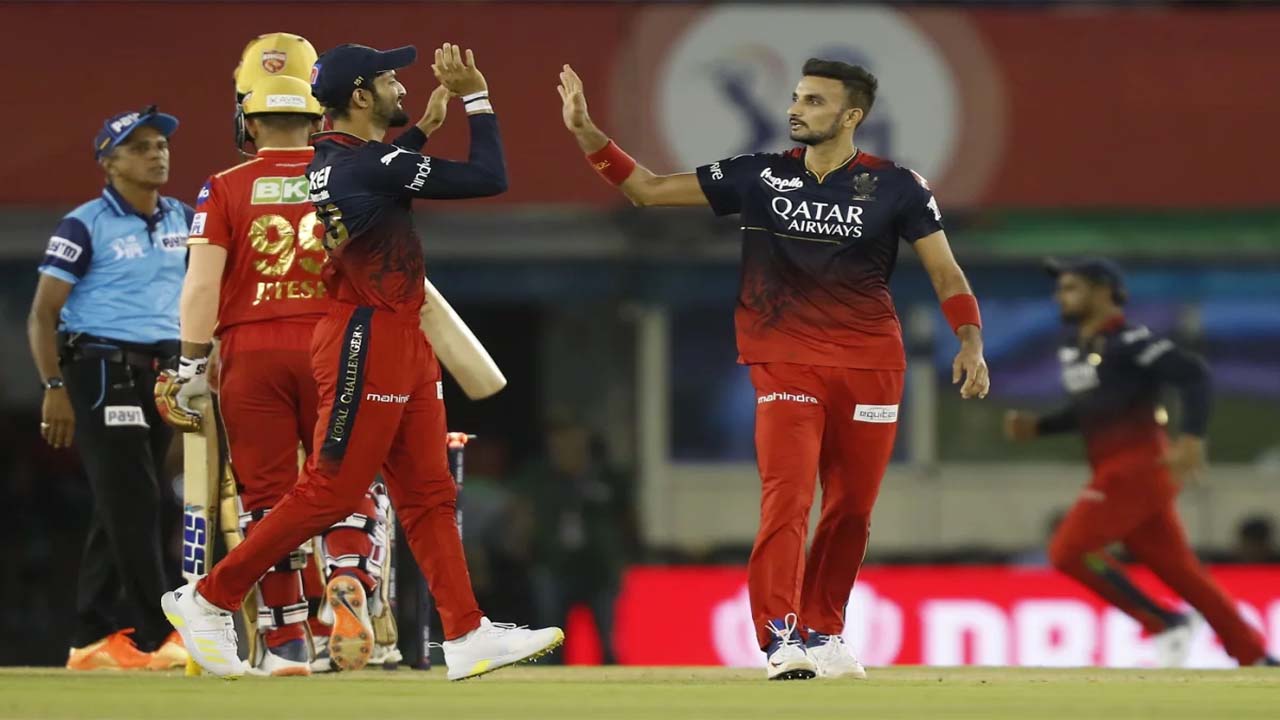कोहली ने 47 गेंद पर पांच चौकों और एक छक्के की मदद से 59 रन बनाकर डु प्लेसिस के साथ 137 रन की साझेदारी की, हालांकि इसके लिये दोनों ने कुल 16 ओवर खेले। कुछ देर बाद डु प्लेसिस भी 56 गेंद पर 84 रन (पांच चौके, पांच छक्के) बनाकर पवेलियन लौट गये। आरसीबी अंतिम ओवरों का लाभ नहीं ले सकी और उसने आखिरी 12 गेंद पर सिर्फ 20 रन जोड़कर 174/4 का स्कोर खड़ा किया। राहुल चाहर को भले ही कोई विकेट हासिल नहीं हुआ, लेकिन उन्होंने चार ओवर में मात्र 24 रन देकर आरसीबी की पारी को रफ्तार पकड़ने से रोका। हरप्रीत ने तीन ओवर में 31 रन देकर दो विकेट लिये, जबकि अर्शदीप सिंह ने चार ओवर में 34 रन देकर एक सफलता हासिल की।