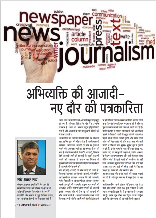 आज कल अभिव्यक्ति की आजादी बहुत बड़ा मुद्दा हो गया है। सोशल मीडिया के दौर में हर व्यक्ति पत्रकार हैं। आज का समाज बहुत बुद्धिजीवी हो गया है और आजादी के नाम पर कुछ भी परोसने को बेताब रहता है। अभिव्यक्ति की आजादी किसी विषय पर शोध के द्वारा अर्जित ज्ञान को बाँटना होता है ना की कुछ भी परोसना। आजकल आजादी के नाम पर कुछ भी करने की स्वतंत्रता चाहिए। आजकल फैशन हो गया है बोलने का की ले के रहेंगे आजादी, छिन के लेंगे आजादी। भले ही आजादी के बहाने कुछ भी करने की स्वतंत्रता से समाज का कितना भी नुकसान हो जाए इस बात की कोई चिन्ता नहीं रहती है आजादी माँगने वाले को।