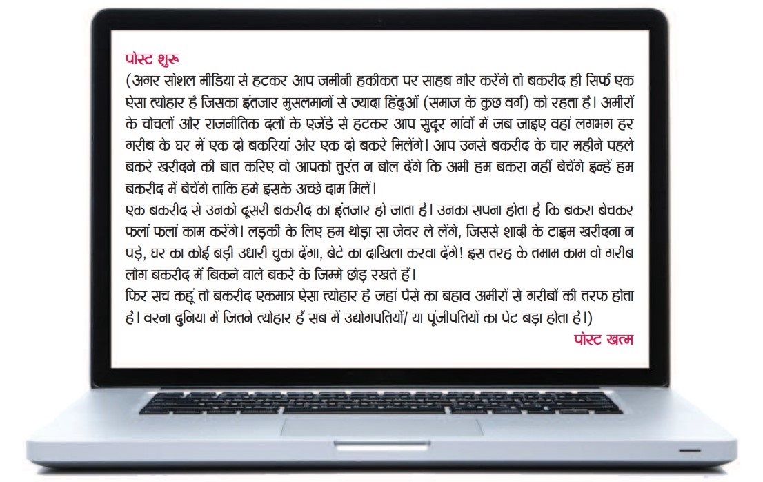 इस पोस्ट में लिखी सभी बातों को मैं नहीं नकारता हूँ लेकिन मुझे ये संदेह है की अन्तिम पैराग्राफ में दिया गया कथन पूरा सत्य तो नहीं हो सकता है। बकरीद एक मात्र ऐसा त्योहार तो नहीं हो सकता है। अगर इस एक मात्र सत्य को सत्य मान लिया जाए तब तो हजारों साल के त्योहार परम्परा पर ही प्रश्न चिन्ह लग जाएगा।