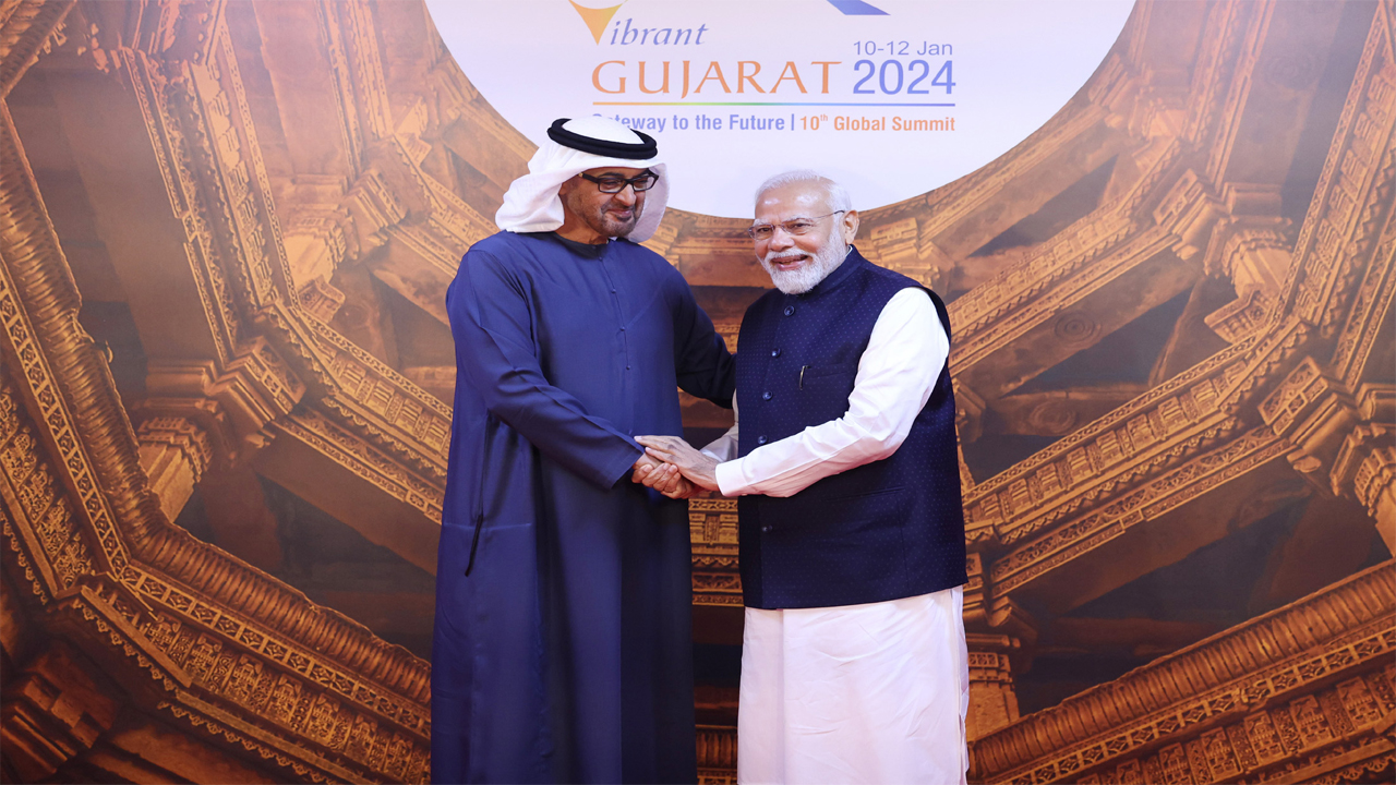 गांधीनगर : नरेन्द्र मोदी ने बुधवार को कहा कि भारत और सयुंक्त अरब अमीरात (यूएई) ने जिस तरह अपने रिश्तों को एक नयी ऊंचाई दी है, उसका बहुत बड़ा श्रेय राष्ट्रपति शेख मोहम्मद बिन जायद को है। मोदी ने गांधीनगर के महात्मा मंदिर में वाइब्रेंट गुजरात समिट के उद्घाटन अवसर पर आज कहा, “ मेरे भाई और यूएई के राष्ट्रपति शेख मोहम्मद बिन जायद का इस आयोजन में शामिल होना हमारे लिये बहुत खुशी की बात है। वाइब्रेंट गुजरात में इस समिट में उनका यहां मुख्य अतिथि के तौर पर उपस्थित होना भारत और यूएई के दिनों-दिन मजबूत होते आत्मीय संबंधों का प्रतीक है। ”