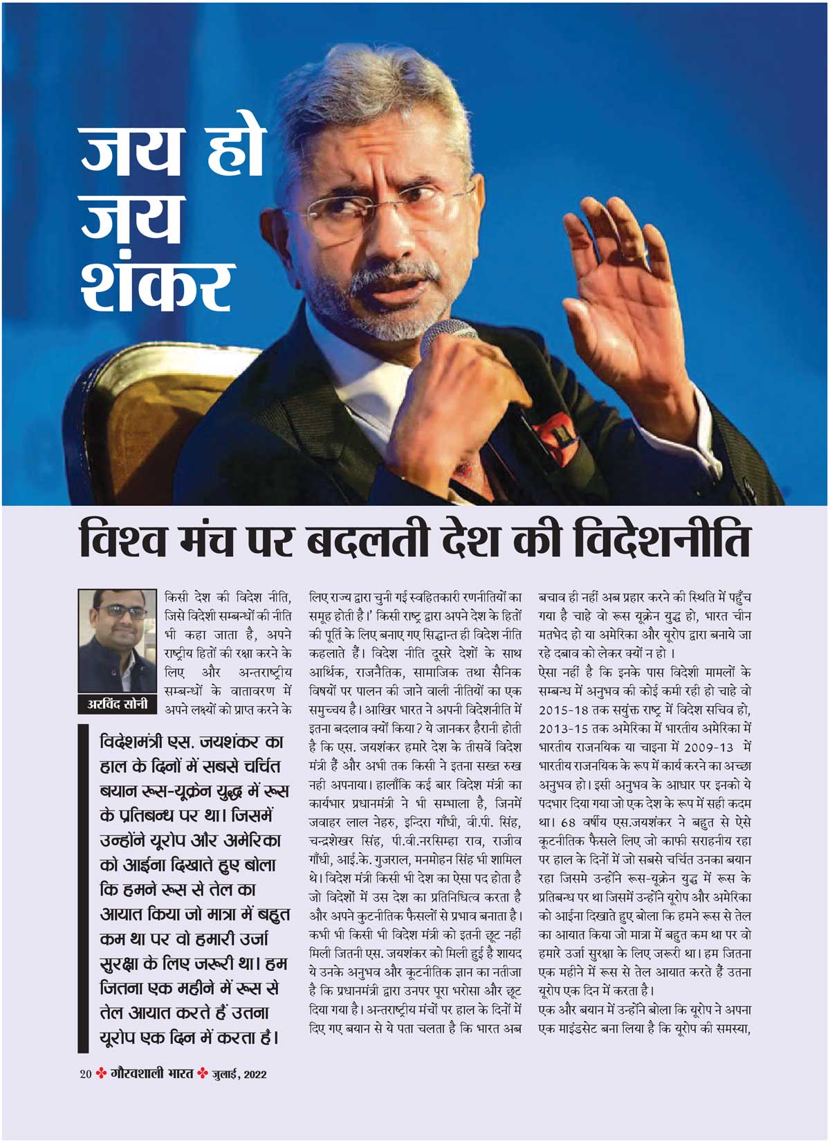 जो विदेशों में उस देश का प्रतिनिधित्व करता है और अपने कुटनीतिक फैसलों से प्रभाव बनाता है। कभी भी किसी भी विदेश मंत्री को इतनी छूट नहीं मिली जितनी एस. जयशंकर को मिली हुई है शायद ये उनके अनुभव और कूटनीतिक ज्ञान का नतीजा है कि प्रधानमंत्री द्वारा उनपर पूरा भरोसा और छूट दिया गया है। अन्तराष्ट्रीय मंचों पर हाल के दिनों में दिए गए बयान से ये पता चलता है कि भारत अब बचाव ही नहीं अब प्रहार करने की स्थिति में पहुँचगया है चाहे वो रूस यूक्रेन युद्ध हो, भारत चीन मतभेद हो या अमेरिका और यूरोप द्वारा बनाये जा रहे दबाव को लेकर क्यों न हो ।
