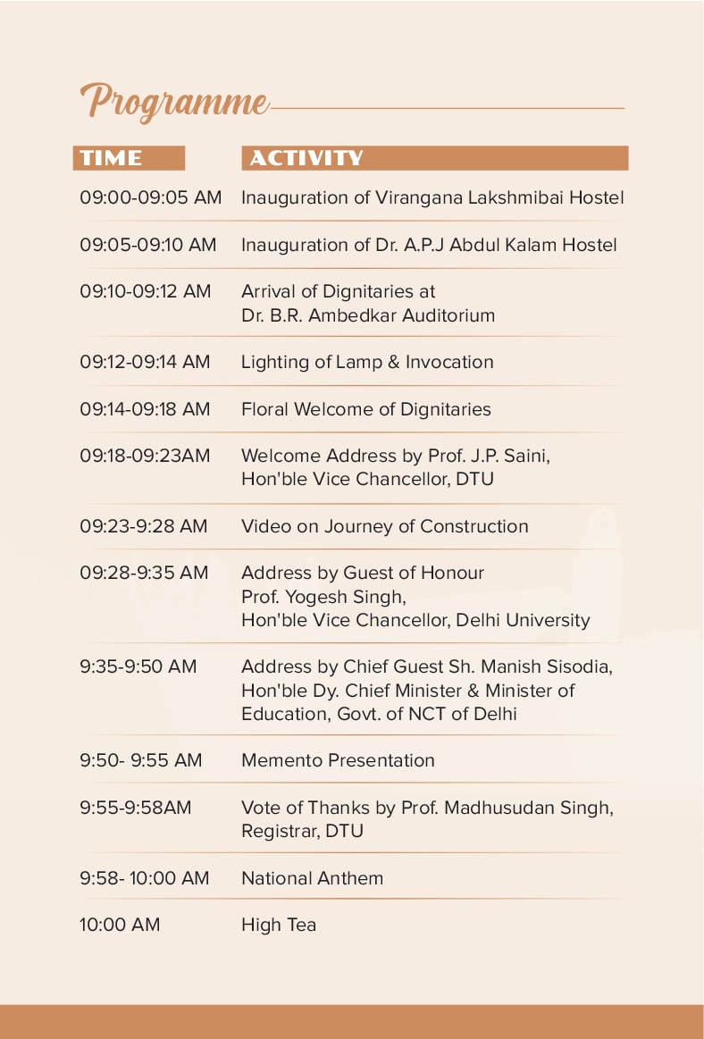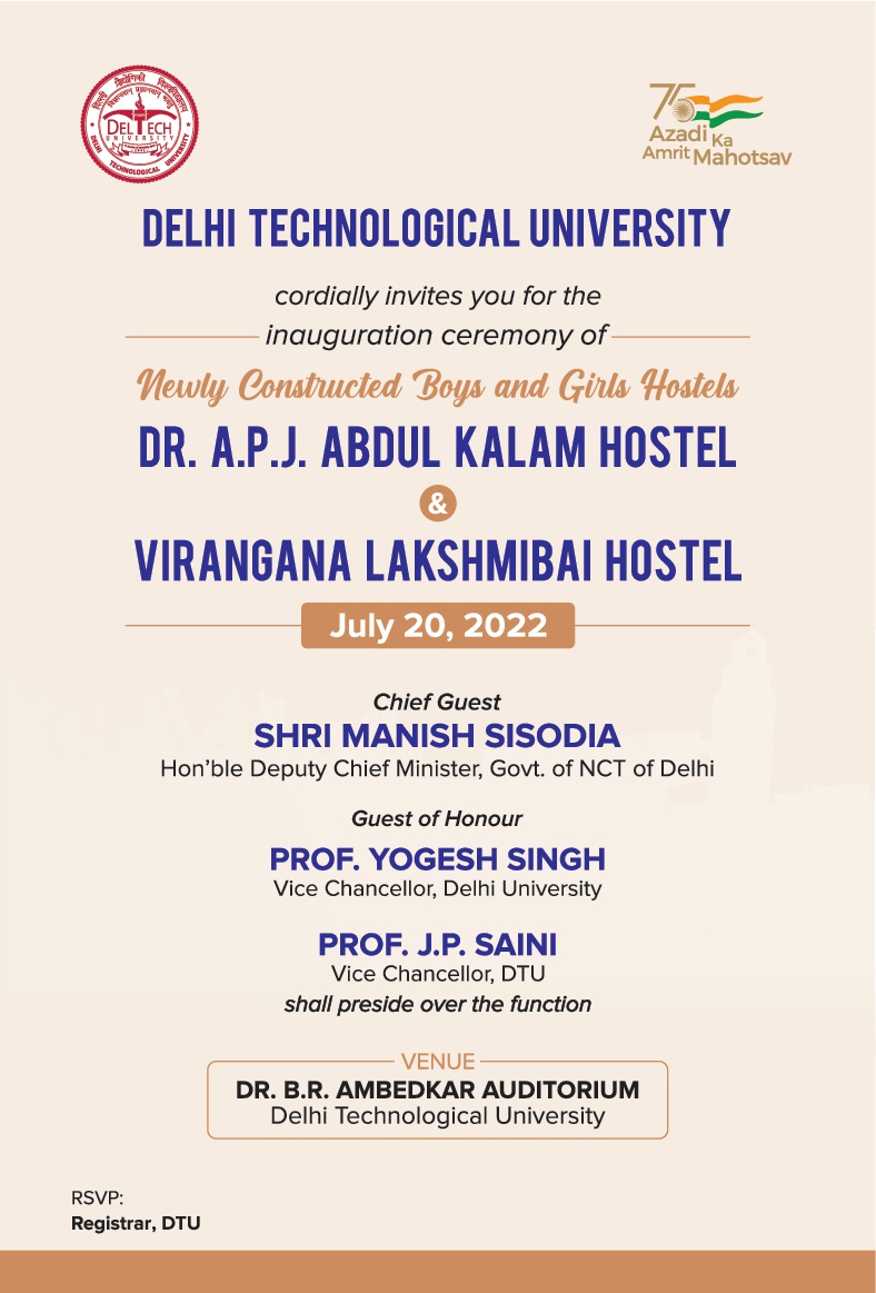 नई दिल्ली: दिल्ली के उपमुख्यमंत्री एवं शिक्षामंत्री मनीष सिसोदिया 20 जुलाई को दिल्ली प्रौद्योगिकी विश्वविद्यालय में नए बने हॉस्टलों का उद्घाटन करेंगे। इस अवसर पर दिल्ली विश्वविद्यालय के कुलपति प्रो. योगेश सिंह विशिष्ट अतिथि के तौर पर उपस्थित रहेंगे तथा डीटीयू कुलपति प्रो. जय प्रकाश सैनी समारोह की अध्यक्षता करेंगे। मुख्यातिथि मनीष सिसोदिया द्वारा 20 जुलाई को सुबह 9:00 बजे डॉ एपीजे अब्दुल कलाम हॉस्टल और 9:05 बजे वीरांगना लक्ष्मीबाई हॉस्टल का उद्घाटन किया जाएगा। उसके पश्चात डीटीयू के बीआर अंबेडकर ऑडिटोरियम में एक विशेष समारोह का आयोजन होगा। इस समारोह के दौरान डीटीयू में इन नए हॉस्टलों के निर्माण की यात्रा पर एक शॉर्ट वीडियो भी प्रदर्शित की जाएगी।