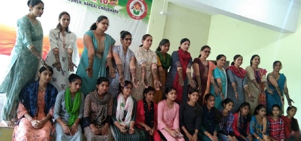 नाँगल चौधरी। करवा चौथ के मांगलिक अवसर पर बुधवार को बैजनाथ चौधरी राजकीय महिला महाविद्यालय में छात्राओं के हुनर को निखारते हुए प्राचार्या डाॅ. अनीता तँवर की अध्यक्षता में महिला प्रकोष्ठ के तहत मेहंदी प्रतियोगिता का भव्य आयोजन किया गया। यह कार्यक्रम महिला प्रकोष्ठ प्रभारी डॉ. सुशीला यादव की देखरेख में संपन्न हुआ। प्रतियोगिता में महाविद्यालय की लगभग 40 प्रतिभागी स्वरुप छात्राओं ने हिस्सा लिया। इस दौरान सभी छात्राओं ने विभिन्न डिज़ाइन सहित अपने हाथों को सुंदर मेहंदी से सजाया।