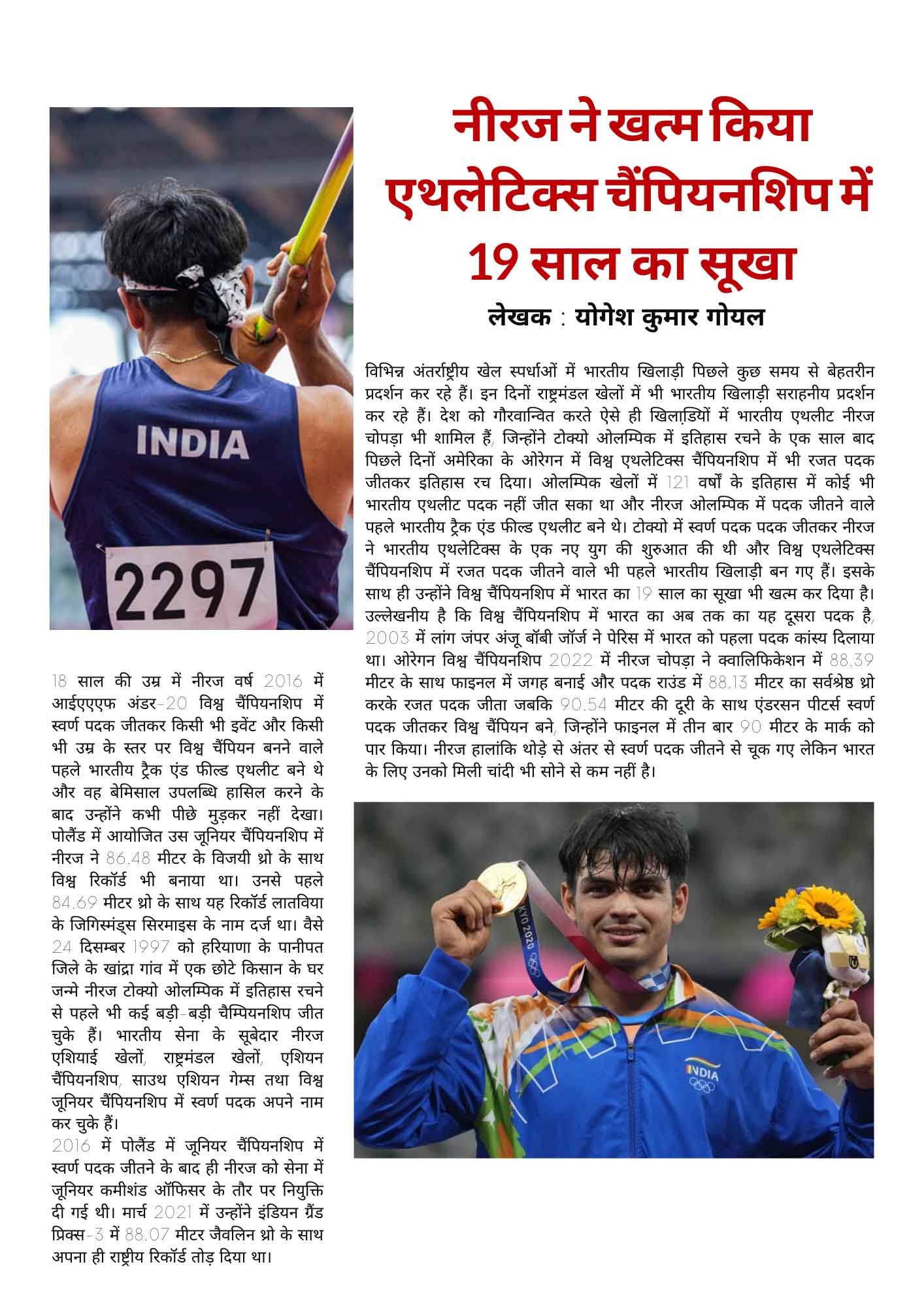 विभिन्न अंतर्राष्ट्रीय खेल स्पर्धाओं में भारतीय खिलाड़ी पिछले कुछ समय से बेहतरीन प्रदर्शन कर रहे हैं। इन दिनों राष्ट्रमंडल खेलों में भी भारतीय खिलाड़ी सराहनीय प्रदर्शन कर रहे हैं। देश को गौरवान्वित करते ऐसे ही खिलाडि़यों में भारतीय एथलीट नीरज चोपड़ा भी शामिल हैं, जिन्होंने टोक्यो ओलम्पिक में इतिहास रचने के एक साल बाद पिछले दिनों अमेरिका के ओरेगन में विश्व एथलेटिक्स चैंपियनशिप में भी रजत पदक जीतकर इतिहास रच दिया। ओलम्पिक खेलों में 121 वर्षों के इतिहास में कोई भी भारतीय एथलीट पदक नहीं जीत सका था और नीरज ओलम्पिक में पदक जीतने वाले पहले भारतीय ट्रैक एंड फील्ड एथलीट बने थे। टोक्यो में स्वर्ण पदक पदक जीतकर नीरज ने भारतीय एथलेटिक्स के एक नए युग की शुरुआत की थी और विश्व एथलेटिक्स चैंपियनशिप में रजत पदक जीतने वाले भी पहले भारतीय खिलाड़ी बन गए हैं। इसके साथ ही उन्होंने विश्व चैंपियनशिप में भारत का 19 साल का सूखा भी खत्म कर दिया है। उल्लेखनीय है कि विश्व चैंपियनशिप में भारत का अब तक का यह दूसरा पदक है, 2003 में लांग जंपर अंजू बॉबी जॉर्ज ने पेरिस में भारत को पहला पदक कांस्य दिलाया था। ओरेगन विश्व चैंपियनशिप 2022 में नीरज चोपड़ा ने क्वालिफिकेशन में 88.39 मीटर के साथ फाइनल में जगह बनाई और पदक राउंड में 88.13 मीटर का सर्वश्रेष्ठ थ्रो करके रजत पदक जीता जबकि 90.54 मीटर की दूरी के साथ एंडरसन पीटर्स स्वर्ण पदक जीतकर विश्व चैंपियन बने, जिन्होंने फाइनल में तीन बार 90 मीटर के मार्क को पार किया। नीरज हालांकि थोड़े से अंतर से स्वर्ण पदक जीतने से चूक गए लेकिन भारत के लिए उनको मिली चांदी भी सोने से कम नहीं है।