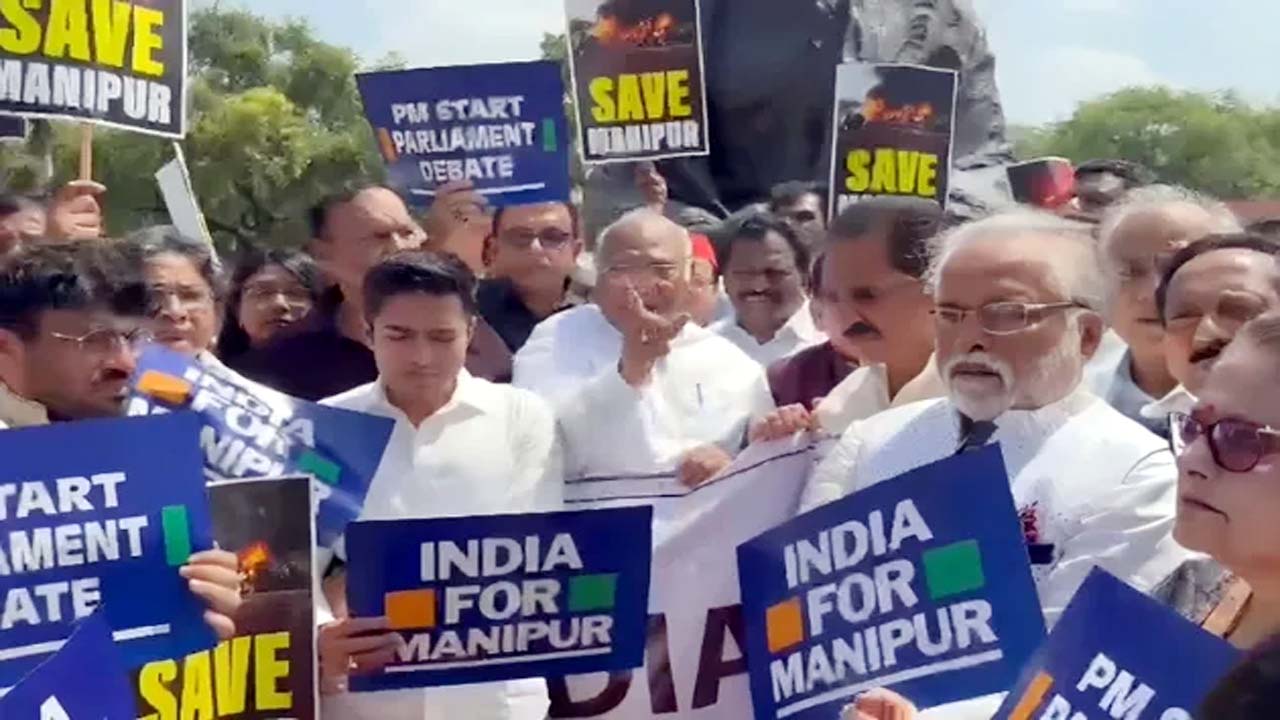 इंडिया गठबंधन के प्रदर्शनकारी सदस्यों ने कहा कि मणिपुर की स्थिति बहुत खराब है और प्रधानमंत्री नरेंद्र मोदी को संसद के दोनों सदनों में इस बारे में बयान देना चाहिए और हालात को नियंत्रित करने के लिए सरकार की योजना बतानी चाहिए।