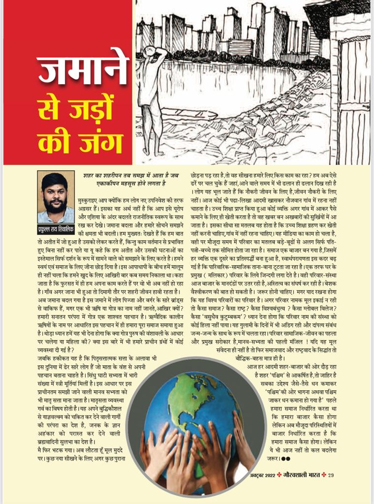 मुस्कुराइए आप क्योंकि हम लोग नए उपनिवेश की तरफ अग्रसर हैं। इसका यह अर्थ नहीं है कि आप इसे यूरोप और एशिया के अंदर बदलते राजनीतिक स्वरूप के साथ रख कर देखे। जमाना बदला और हमारे सोचने समझने की क्षमता भी बदली। हम मुख्यत: देखते हैं कि हम बात तो अतीत में जो हुआ है उसको लेकर करते हैं, किन्तु काम वर्तमान से प्रभावित हुए बिना नहीं कर पाते या यू कहे कि हम अतीत और उसकी घटनाओं का इस्तेमाल सिर्फ दर्शन के रूप में सामने वाले को समझाने के लिए करते है। हमने स्वयं एवं समाज के लिए जीना छोड़ दिया है। इस आपाधापी के बीच हमें मालूम ही नहीं चला कि हमने खुद के लिए आखिरी बार कब समय निकाला था। कहा जाता है कि फुरसत में ही हम अपना काम करते हैं पर वो भी अब नहीं हो रहा है। गाँव अगर जाना भी हुआ तो दिमागी तौर पर शहरी जीवन हावी रहता है। अब जमाना बदल गया है इस जमाने में लोग पिज्जा और बर्गर के सारे ब्रांड्स से वाकिफ हैं, मगर एक भी ऋषि या गोत्र का नाम नहीं जानते,आखिर क्यों? हमारी सनातन परंपरा में गोत्र एक शाश्वत पहचान है। ऋग्वैदिक कालीन ऋषियों के नाम पर आधारित इस पहचान में ही हमारा पूरा समाज समाया हुआ है। थोड़ा ध्यान हमें यह भी देना होगा कि क्या गोत्र पुरुष की वंशावली के आधार पर चलेगा या महिला की? क्या इस बारे में भी हमारे प्राचीन ग्रंथों में कोई व्यवस्था दी गई है?