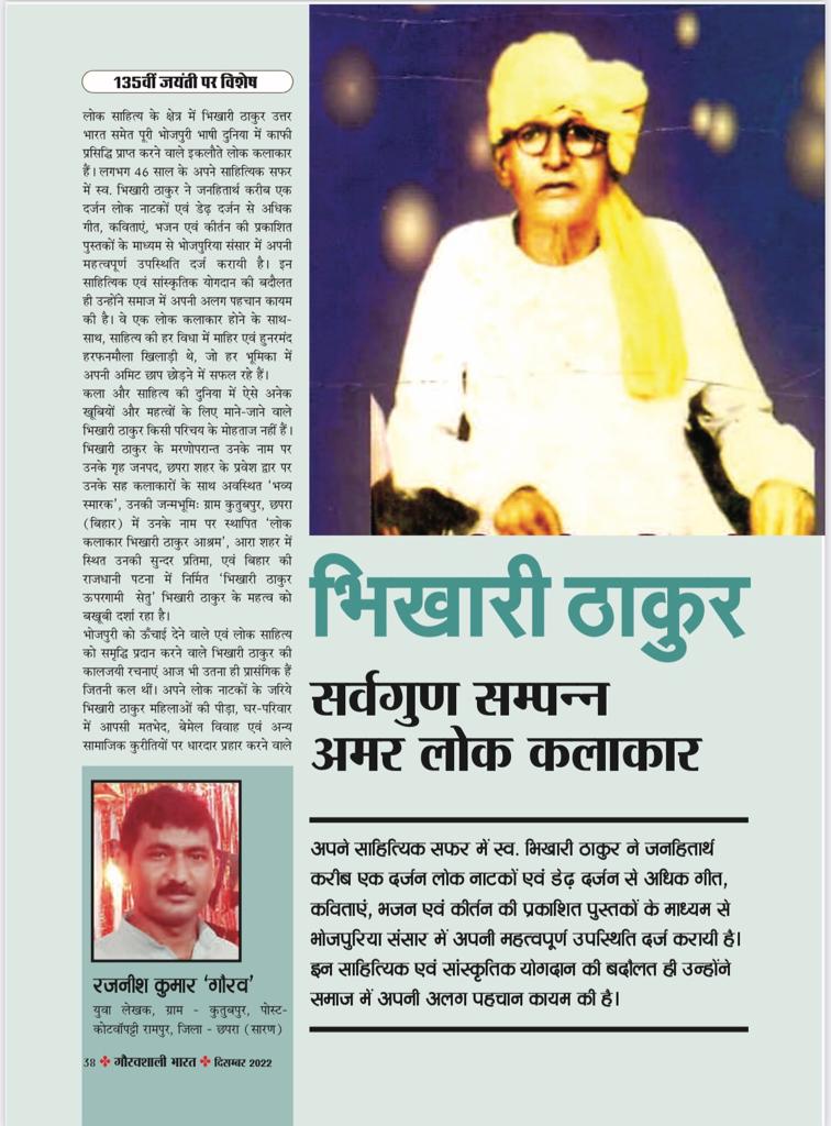 आम जन-मानस में रच बस जाने वाले भिखारी ठाकुर जैसे लोक कलाकार बिरले ही होते हैं। साहित्य के इतिहास में वह सम्भवत: पहले लोक कलाकार हैं, जिनके कुशल कला प्रशिक्षण एवं उच्च मार्गदर्शन में पले-पढ़े उनके सह कलाकार 90 वर्षीय रामचन्द्र मांझी, नगरा (सारण) को पिछले साल 2021 में भारत सरकार द्वारा पदमश्री सम्मान से नवाजा गया। भिखारी ठाकुर की जयन्ती एवं पुण्यतिथि प्रत्येक साल उनके गाँव, जिला एवं राज्य के अलावा पूरे देश और दुनिया में विभिन्न सरकारी एवं गैर सरकारी संस्थाओं द्वारा पूरी शिद्दत के साथ श्रद्धापूर्वक मनाने की होड़ मची रहती है।अपनी कालजयी रचनाओं के बूते भिखारी ठाकुर भविष्य में भी निसंदेह सदियों तक याद किए जाते रहेंगे, किन्तु जरूरत है कि इस भोजपुरी रत्न एवं गौरवशाली बिहार के इस महान लोक कलाकार को भारत सरकार द्वारा प्रदत्त सर्वोच्च सम्मान पदम विभूषण एवं भारत रत्न जैसे शिखर सम्मान से मरणोपरान्त सम्मानित करने की, ताकि भोजपुरी प्रेमियों, उनके परिजनों, कला प्रेमियों तथा आम जनमानस का दिल इस ऐतिहासिक घोषणा से आह्लादित हो सके, क्योंकि –