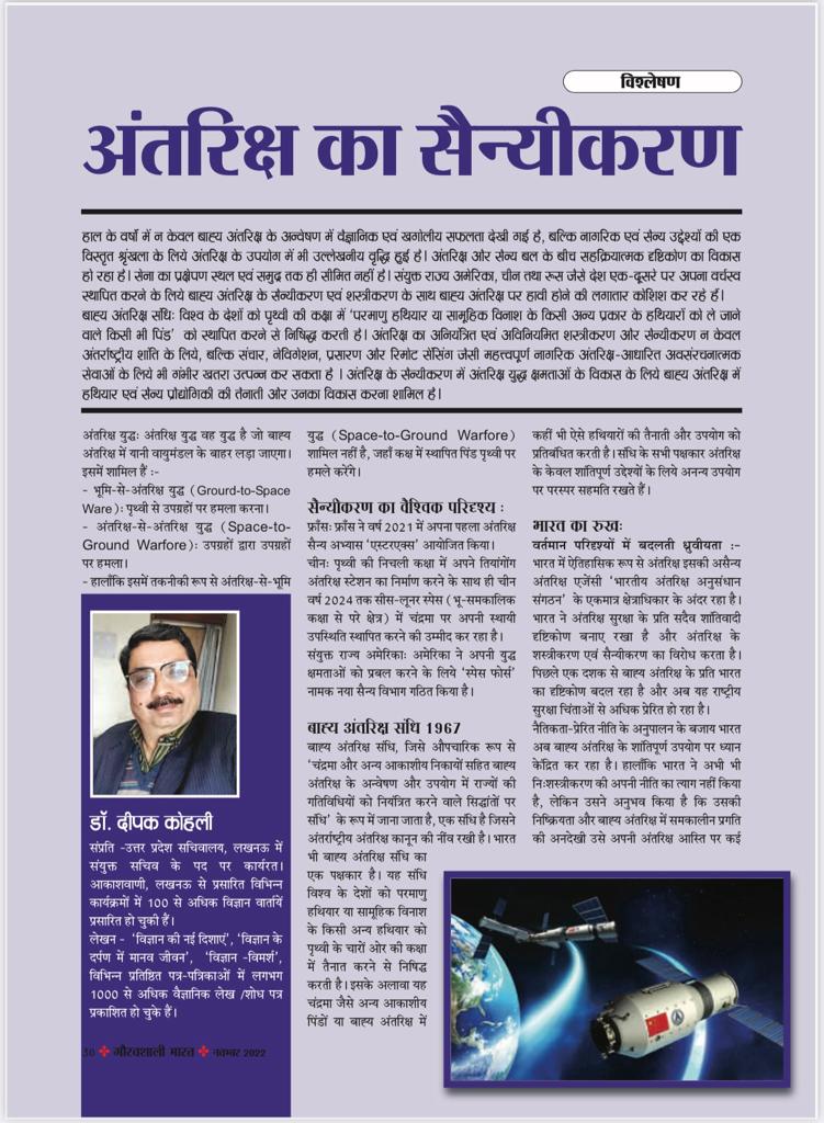 ‘ग्लोबल कॉमन’ का ‘ग्लोबल गवर्नेंस’ :- बाह्य अंतरिक्ष एक साझा विरासत है और इसकी परिसंपत्तियों पर प्रत्येक मानव का एक समान अधिकार है। आधुनिक वैश्विक अर्थव्यवस्थाएँ अंतरिक्ष संपत्तियों पर बहुत अधिक निर्भर करती हैं। ग्लोबल पोजिशनिंग सिस्टम, टेलीकॉम नेटवर्क और पूर्व-चेतावनी प्रणाली एवं मौसम पूवार्नुमान दुनिया भर में शासन के लिये महत्त्वपूर्ण उपकरण है। एक अनियंत्रित सैन्यीकरण इन सुविधाओं को विनष्ट कर देगा, इसलिये वैश्विक बहुपक्षीय मंचों पर इस मुद्दे की निगरानी करना और हथियारों की दौड़ को रोकने तथा मौजूदा प्रणाली में मौजूद किसी भी कानूनी अंतराल को भरने के लिये कानूनी रूप से बाध्यकारी साधनों को विकसित करना महत्त्वपूर्ण है।’’