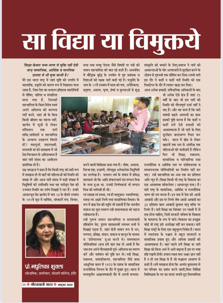 त्वं स्वाछा त्वं स्वधा, त्वं ही वस्तुकार: स्वरात्मिका, स्वधा त्वं अक्षरे नित्ये तथा मात्रात्मिका स्थिता। के रूप में ब्रह्म देव की स्तुति भी दशार्ती है कि भारतीय समाज का मूल स्वरूप स्त्री सत्तात्मकता को सहज स्वीकारता है। स्त्री पुरूष समान सहभागिता व समतावादी दृष्टिकोण वेद, पुराण महाकाव्यों लगभग सभी मे दिखाई पड़ता है, जहां दोनों समान रूप से धन, परम्परा, प्रतिष्ठा, संतान, समाज व कानून के पालक व ‘प्रतिपालक’ हुआ करते थे। समयकाल परिस्थितियां आज हमें यहां तक ले आयी है कि जब हम अपने गौरवशाली पूर्व-अस्तित्व का स्मरण करें और वर्तमान को पुष्टि कर ले। स्त्री शिक्षा, स्वास्थ्य, सशक्तीकरण, सहभागिता जैसे शब्द आधुनिक काल में 1970 के दशक के सामाजिक राजनीतिक चिन्तन के दौर में मुखर हुए। भारत में मध्ययुगीन आक्रमणकारी दौर में अपनी सभ्यता-संस्कृति को बचाने के लिए,समाज ने नारी को आकान्ताओं के घोर अत्याचारों से सुरक्षित करने के उद्देश्य से गृहस्थी तक सीमित कर दिया। लम्बे चले इस दौर ने कहीं न कहीं नारी स्थिति को एक पिछड़ेपन के दौर में लाकर खड़ा कर दिया। आज अनेक प्रयासों, संवैधानिक अधिकारों के बाद भी अनेक ऐसे क्षेत्र हैं जहां 75 वर्षों के बाद भी हम नारी की स्थिति को गौरवपूर्ण दर्जा नहीं दे पाए हैं। और यह सत्य है कि नारी संबंधी बढ़ते अपराधों का ग्राफ इसकी पुष्टि करता है कि कहीं न कहीं हमें ऐसे प्रयासों की आवश्यकता है जो नारी के लिए सुरक्षित वातावरण तैयार कर सके। भारत में खेत से लेकर खदानों तक धरा से अंतरिक्ष तक महिलाओं की भागीदारी है लेकिन फिर भी शिक्षा, स्वास्थ्य, सामाजिक व पारिवारिक तथा राजनीतिक व आर्थिक स्तर पर संतोषजनक व सम्मानजनक परिस्थितियों का निर्माण नहीं कर पाए। स्त्री सहभागिता का अब तक का प्रतिशत अति न्यून है। शिक्षा किसी भी राष्ट्र के विकास का एक आवश्यक सॉफ्टवेयर (आधारभूत तत्व) है। यही राष्ट्र के सामाजिक, आर्थिक व राजनीतिक भाग्य को तय करता है। इन सब में देश की आधी आबादी और इस पर निर्भर शेष आधी आबादी का 25 प्रतिशत बाल आबादी कुशल मातृ शक्ति पर निर्भर है। नारी शिक्षा का विस्तार उन लक्ष्यों में से एक होना चाहिए, जिसे सरकारें भविष्य के विकास के मापदण्ड के रूप में माने। विकास का इच्छुक कोई भी राष्ट्र इसे अनदेखा नहीं कर सकता। नारी शिक्षा राष्ट्रों के लिए एक बहुमूल्य निवेश है। भारत में स्वतंत्रता के पश्चात से बहुत सरकारी व सामाजिक प्रयास हुए और अधिक प्रयासों की आवश्यकता है। यहां पहले हमें शिक्षा या नारी शिक्षा को किस अर्थ में आगे बढ़ाना है इस पर स्पष्ट दृष्टि रखनी होगी। हमारा लक्ष्य मात्र अक्षर ज्ञान नहीं है न ही उस शिक्षा से है जो पाश्चात्य आवरण से ढकी है। हमें समझना होगा कि अत्यंत कुशलता से 