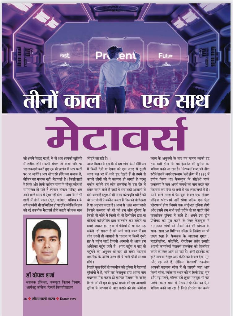 पिछले कुछ दिनों से तकनीक की दुनिया में मेटावर्स सुर्खियों में है, चाहे वह फेसबुक द्वारा अपना नाम बदलकर मेटा करना हो या फिर मेटावर्स के जरिए किसी मां की मृत हो चुकी बच्ची को इस आभासी दुनिया के माध्यम से बात कराने की हो। कोरोना काल के अनुभवों के बाद यह मानना काफी हद तक सही होगा कि यह इंटरनेट की दुनिया का भविष्य बनने जा रहा है। ‘मेटावर्स’ शब्द को नील स्टीफेंसन ने अपने उपन्यास ‘स्नो क्रैश’ में 1992 में प्रयोग किया था। फेसबुक के सीईओ मार्क जकरबर्ग ने जब अपनी कंपनी का नाम बदल कर मेटावर्स कर दिया था तभी से यह शब्द चर्चा में है। आने वाले समय में फेसबुक केवल एक सोशल मीडिया प्लेटफार्म नहीं रहेगा बल्कि एक ऐसा प्लेटफार्म होगा जिसमे एक वर्चुअल दुनिया होगी और उसमें हम सभी उसी तरीके से रह पाएंगे जैसे वास्तविक दुनिया में रहते हैं। अपने इस ड्रीम प्रोजेक्ट को पूरा करने के लिए फेसबुक ने 10,000 लोगों को नौकरी देने की घोषणा के साथ- साथ 50 मिलियन डॉलर के निवेश का भी लक्ष्य रखा है। फेसबुक के आलावा गूगल , माइक्रोसॉफ्ट, फोर्टनिटे, रोब्लोक्स क्रॉप इत्यादि अग्रणी कम्पनियाँ मेटावर्स तकनीक को विकसित करने के लिए आगे आ रही हैं। अभी इंटरनेट का इस्तेमाल करते हुए आप कंटेंट को केवल देख, सुन और पढ़ पाते हैं, लेकिन ‘मेटावर्स’ तकनीक आपको एडवांस स्टेज में ले जाएगी जहां आप किसी चीज, व्यक्ति या स्थान को ना सिर्फ देख, सुन और पढ़ पाएंगे, बल्कि उसे छूकर महसूस भी कर पाएंगे। सरल भाषा में मेटावर्स इंटरनेट का ऐसा भविष्य बनने जा रहा है जिसे इंटरनेट का वर्जन 2.0 भी कहा जा रहा है।आवश्यकता को अविष्कार की जननी कहा जाता है। इतिहास गवाह है की जब जब मनुष्य को कोई आवश्यकता हुई तब-तब नए अविष्कार हुए। आज का मानव इतना व्यस्त हो चुका है की उसके पास समय का अभाव है। मनुष्य समय तो नहीं बढ़ा सकता लेकिन समय बचा सकता है। समय को बचाने की आवश्यकता ने ही मेटावर्स तकनीक को ईजाद किया है। मेटावर्स शब्द मूलत: दो शब्दों से मिलकर बना है मेटा और वर्स मेटा शब्द का अर्थ ‘परे’ (बियॉन्ड) होता है। वर्स शब्द यूनिवर्स से लिया गया है, जिसका अर्थ ‘ब्रह्मांड’ होता है । इस प्रकार मेटावर्स शब्द का मतलब ‘ब्रह्मांड से परे’ (बियॉन्ड यूनिवर्स) है। मेटावर्स सीमाओं से परे एक ऐसी आभासी दुनिया होगी जो हम सबको वास्तविक दुनिया की तरह आभासी दुनिया में जीने का अवसर देगी। आसान शब्दों में कहें तो आर्टिफिशियल इंटेलिजेंस, मशीन लर्निंग, सोशल मीडिया, आँग्मेंटेड रियलिटी, वर्चुअल रियलिटी के साथ साथ अनगिनत विकसित हो चुकी या विकसित हो रही तकनीकों का एक मिश्रण होगी मेटावर्स की दुनिया। मेटावर्स के माध्यम से आप वो सारे काम कर पाएंगे जो आज आपको असंभव लगता है। आप किसी वर्चुअल कॉन्सर्ट में जा पाएंगे,आ