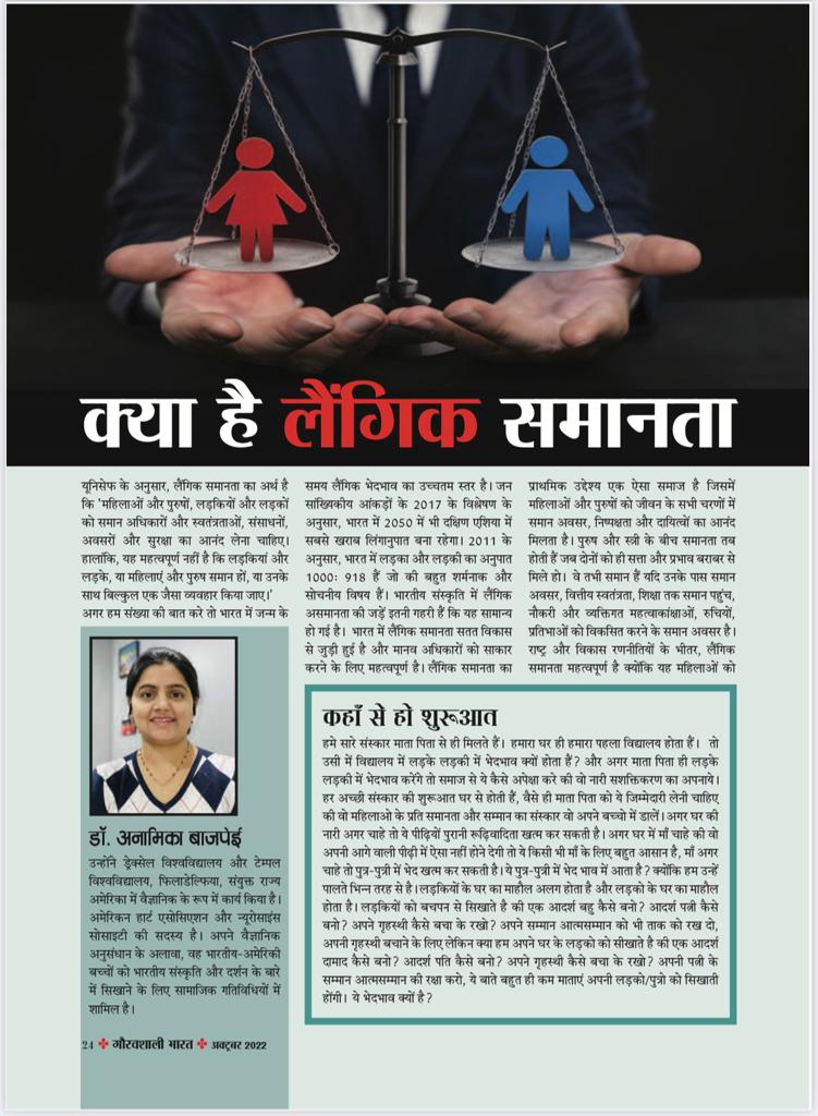 यूनिसेफ के अनुसार, लैंगिक समानता का अर्थ है कि ’महिलाओं और पुरुषों, लड़कियों और लड़कों को समान अधिकारों और स्वतंत्रताओं, संसाधनों, अवसरों और सुरक्षा का आनंद लेना चाहिए। हालांकि, यह महत्वपूर्ण नहीं है कि लड़कियां और लड़के, या महिलाएं और पुरुष समान हों, या उनके साथ बिल्कुल एक जैसा व्यवहार किया जाए।’ अगर हम संख्या की बात करे तो भारत में जन्म के समय लैंगिक भेदभाव का उच्चतम स्तर है। जन सांख्यिकीय आंकड़ों के 2017 के विश्लेषण के अनुसार, भारत में 2050 में भी दक्षिण एशिया में सबसे खराब लिंगानुपात बना रहेगा। 2011 के अनुसार, भारत में लड़का और लड़की का अनुपात 1000: 918 हैं जो की बहुत शर्मनाक और सोचनीय विषय हैं। भारतीय संस्कृति में लैंगिक असमानता की जड़ें इतनी गहरी हैं कि यह सामान्य हो गई है। भारत में लैंगिक समानता सतत विकास से जुड़ी हुई है और मानव अधिकारों को साकार करने के लिए महत्वपूर्ण है। लैंगिक समानता का प्राथमिक उद्देश्य एक ऐसा समाज है जिसमें महिलाओं और पुरुषों को जीवन के सभी चरणों में समान अवसर, निष्पक्षता और दायित्वों का आनंद मिलता है। पुरुष और स्त्री के बीच समानता तब होती हैं जब दोनों को ही सत्ता और प्रभाव बराबर से मिले हो। वे तभी समान हैं यदि उनके पास समान अवसर, वित्तीय स्वतंत्रता, शिक्षा तक समान पहुंच, नौकरी और व्यक्तिगत महत्वाकांक्षाओं, रुचियों, प्रतिभाओं को विकसित करने के समान अवसर है। राष्ट्र और विकास रणनीतियों के भीतर, लैंगिक समानता महत्वपूर्ण है क्योंकि यह महिलाओं को ऐसे निर्णय लेने में सक्षम बनाती है जो उनके समग्र स्वास्थ्य और उनके जीवनसाथी और परिवारों को प्रभावित करते हैं। भारत में लैंगिक समानता सभी दृष्टिकोणों से विकसित होने की समय की आवश्यकता है। हालांकि, यह स्वीकार करना आवश्यक है कि जहां लैंगिक असमानता मौजूद है, वहां महिलाओं को आमतौर पर निर्णय लेने और आर्थिक और सामाजिक संसाधनों तक पहुंच में बहिष्कृत या वंचित किया जाता है।