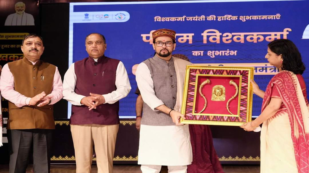 शिमला : अनुराग सिंह ठाकुर ने कहा कि रविवार को विश्वकर्मा दिवस पर प्रधानमंत्री नरेंद्र मोदी ने दिल्ली से 13 हजार करोड़ रुपए की पीएम विश्वकर्मा योजना का शुभारम्भ किया है जो कि देश के शिल्पकारों को मान सम्मान देने की पहल है और इस योजना से उनका कौशल निर्माण होगा। ठाकुर आज यहाँ गेयटी थियेटर शिमला से पीएम विश्वकर्मा योजना के शुभारम्भ में वर्चुअल माध्यम से जुड़े थे। उन्होंने कहा कि पीएम विश्वकर्मा योजना के द्वारा कारीगरों और शिल्पकारों को कौशल उन्नयन, टूलकिट प्रोत्साहन, डिजिटल लेनदेन के लिए प्रोत्साहन तथा विपणन सहायता प्रदान की जाएगी।