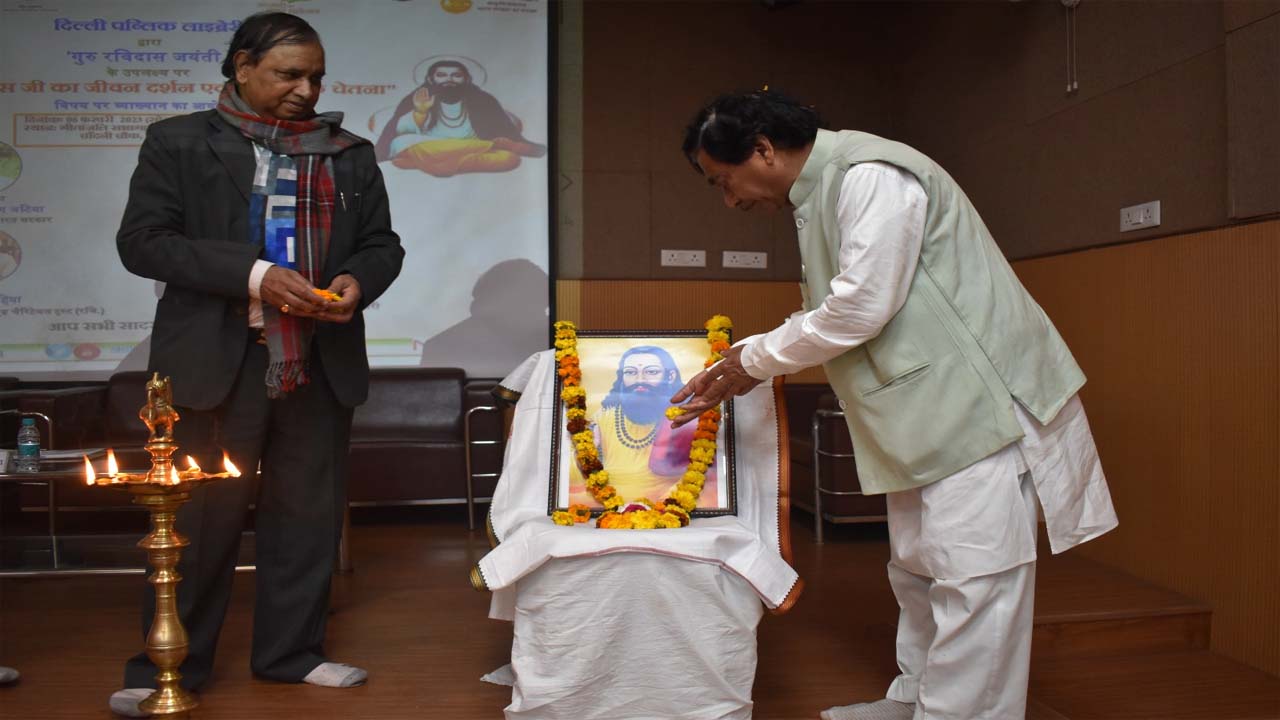 नई दिल्ली : दिल्ली पब्लिक लाइब्रेरी द्वारा ‘गुरु रविदास जयंती’ के उपलक्ष्य पर दिनांक 06 फरवरी 2023 को प्रात: 11.00 बजे संत रविदास का जीवन दर्शन एवं सामाजिक चेतना विषय पर व्याख्यान का आयोजन किया गया। दिल्ली लाइब्रेरी बोर्ड के अध्यक्ष श्री सुभाष चंद्र कानखेड़िया की अध्यक्षता एवं महानिदेशक डॉ. आर. के. शर्मा के मार्गदर्शन में आयोजित इस कार्यक्रम में मुख्य वक्ता के रूप में भारत सरकार के पूर्व कैबिनेट मंत्री डॉ. सत्यनारायण जटिया एवं वक्ता के रूप में सतगुरु रविदास रिसर्च एंड चैरिटेबल ट्रस्ट (रजि.) के चेयरमैन डॉ. मनोज दहिया उपस्थित रहे ।
