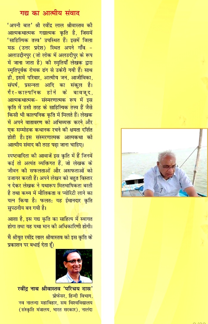 पुस्तक पर प्रतिष्ठित लेखक एवं प्रशासक , नव नालंदा महाविहार सम विश्वविद्यालय ( संस्कृति मंत्रालय , भारत सरकार ), नालंदा के हिन्दी विभाग के प्रोफ़ेसर व पूर्व अध्यक्ष , मैथिली-भोजपुरी अकादमी , दिल्ली सरकार एवं हिन्दी अकादमी , दिल्ली के पूर्व सचिव प्रोफ़ेसर रवींद्र नाथ श्रीवास्तव ‘परिचय दास’ की जो सम्मति- शुभासंसा प्रकाशित हुई है , वह इस प्रकार है – ” श्री रवींद्र लाल श्रीवास्तव की आत्मकथात्मक गद्यात्मक कृति —