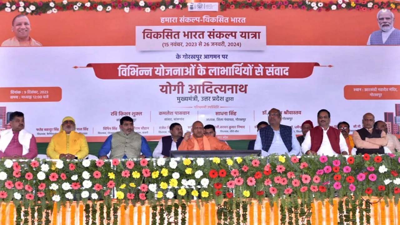 इस अवसर पर योगी ने विकसित भारत संकल्प यात्रा की चर्चा की और कहा कि पिछले साढ़े नौ वर्षों के अंदर देश मे 10 करोड़ से अधिक गरीबों के शौचालय बनाए गए हैं जिसमें से 4 करोड़ शौचालय उत्तर प्रदेश के लोगों के बने हैं। देश मे 4 करोड़ गरीबों के आवास बनवाए गए हैं जिनमें से 55 लाख यूपी में बने हैं। देश में 50 करोड़ लोगों को आयुष्मान योजना से पांच लाख रुपये तक के मुफ्त इलाज की सुविधा का लाभ मिल रहा हैए यूपी में इस योजना से 10 करोड़ लोग सुविधा प्राप्त कर रहे हैं।