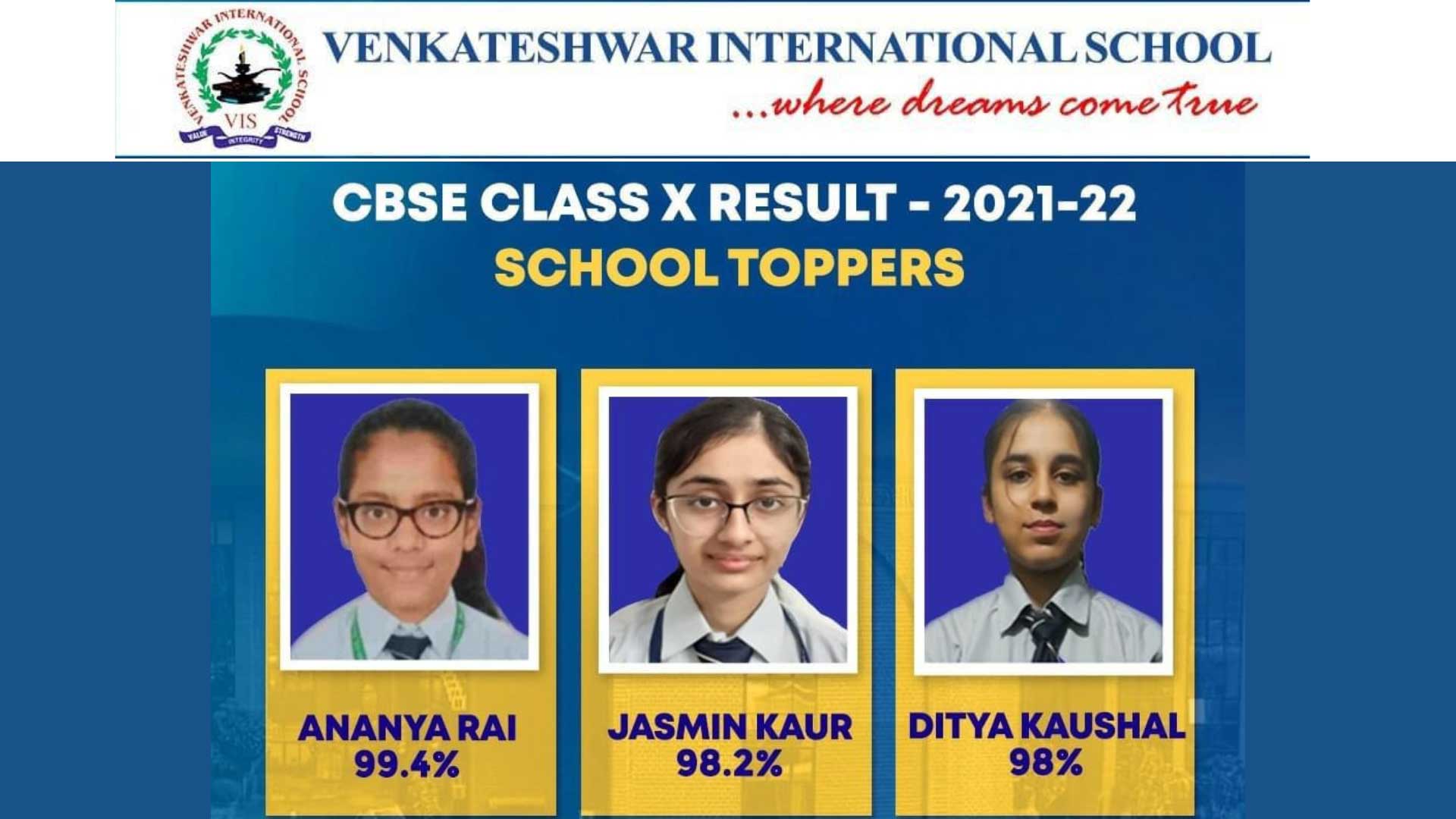 नई दिल्ली: केंद्रीय माध्यमिक शिक्षा बोर्ड की ओर से जारी दसवीं कक्षा के परीक्षा परिणाम में वेंकटेश्वर इंटरनेशनल स्कूल, द्वारका दिल्ली के विद्यार्थियों ने बहुत ही शानदार प्रदर्शन किया।
