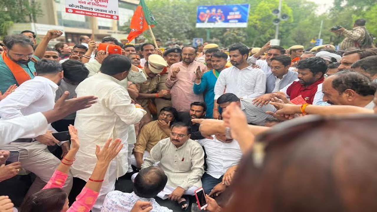 केजरीवाल के इस्तीफे की मांग को लेकर आप मुख्यालय के बाहर जोरदार विरोध प्रदर्शन