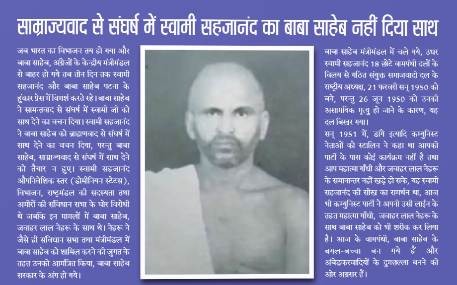 बाबा साहेब सन् 1930 के आसपास, गोलमेज कांफ्रेंस में अंग्रेजों की पृथकतावादी राजनीति के साथ थे। फिर वे सन् 1932 में महात्मा गाँधी के साथ पूना पैक्ट करते हैं, सन् 1937 के चुनाव में मिली हार के बाद वे अपने को महात्मा गाँधी के छल का भुक्तभोगी समझने लगे, यह वही समय था जब उन्होंने जातिवादी विचार छोड़कर, इंडियन लेबर पार्टी का गठन कर राष्ट्रीय राजनीति में प्रवेश किया। सन् 1938 ई. में बाबा साहेब ने मुंबई में स्वामी सहजानंद के अभिनंदन में एक सभा का आयोजन किया गया, जिसमें अमृतपाद डांगे, मीरजाकर, इंदुलाल याज्ञिक आदि वामपंथी नेताओं ने भी शिरकत की। बाबा साहेब का कहना था कि – ‘कांग्रेस बडे पूंजीपतियों की पार्टी है और महात्मा गांधी उनके नेता हैं, आप लोग कांग्रेस को छोड़कर बाहर आईये और हम लोग मिलकर एक नई पार्टी बनाएं’। स्वामी सहजानंद का उत्तर था – ‘हरिपुरा कांग्रेस के बाद (1938 ) कांग्रेस पर हम लोगों का कब्जा है, वामपंथ के नेता सुभाष चन्द्र बोस इसके अध्यक्ष हैं, तो हम लोग क्यों कांग्रेस को छोडें, आप कांग्रेस में आईये तथा वामपंथियों को मजबूत करिये’। बाबा साहेब, इस पर तैयार नहीं हुए। इसके बाद अंग्रेजों ने बाबा साहेब को प्रलोभन दिया कि सरकार आपको शीघ्र ही बड़ा पद देने वाली है और इस तरह से अंग्रेजों ने उन्हें वायसराय की कौंसिल का सदस्य बना दिया। इसके उपरान्त वामपंथ और बाबा साहेब के बीच खाई बढ़ती गई।