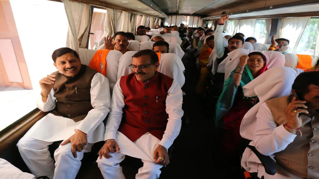 भोपाल : मोहन यादव के साथ उनका मंत्रिमंडल आज उत्तरप्रदेश स्थित अयोध्या धाम में दर्शन के लिए रवाना हुआ। यादव के साथ सभी मंत्री बस के माध्यम से राजा भोज विमानतल पहुंचे, जहां से सभी ने अयोध्या के लिए उड़ान भरी। भारतीय जनता पार्टी के प्रदेश अध्यक्ष विष्णुदत्त शर्मा भी बस में सवार होकर विमानतल पहुंचे और सभी मंत्रियों को विदाई दी। मंत्रिमंडल के सभी सदस्य आज श्री राम के दर्शन कर शाम को वापस लौटेंगे।